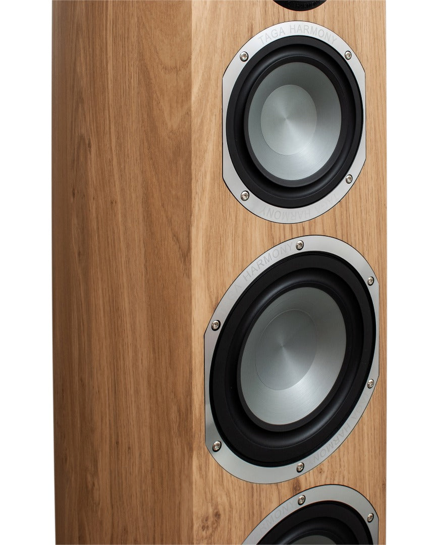 The Taga Harmony Platinum F-120 v.3 Floorstanding Speaker, designed for exceptional audio performance, features a 3-way, 4-driver configuration with a passive radiator, ensuring a balanced and immersive sound experience. With its Bi-wiring capability and TLIE Enclosure design, it optimizes sound reproduction across a wide frequency range, from 28Hz to 40kHz, catering to both subtle nuances in music and explosive cinematic moments in home theaters. Its high-frequency driver, midrange driver, and dual bass drivers, coupled with a passive radiator, deliver precise highs, detailed midranges, and deep, impactful bass. Boasting a sensitivity rating of 93dB and an impedance of 6 ohms, these speakers efficiently utilize amplifier power while maintaining clarity and accuracy in sound reproduction. Whether you're enjoying music or movies, the Taga Harmony Platinum F-120 v.3 promises to elevate your listening experience with its robust construction, meticulous engineering, and impressive sonic performance.